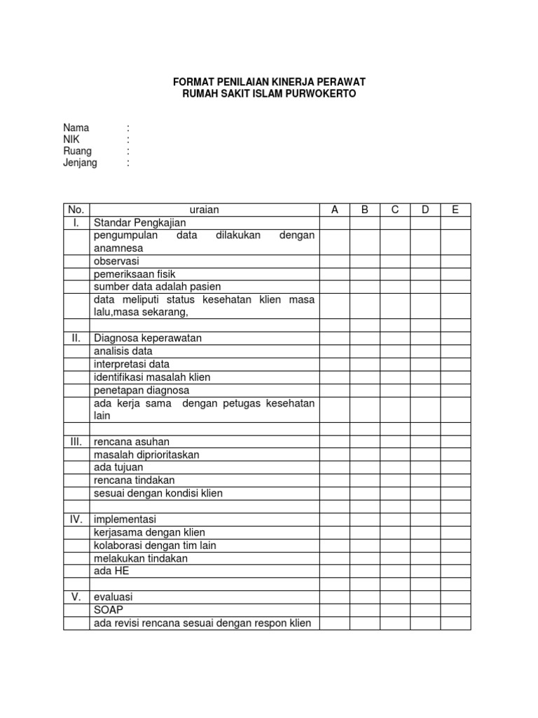 2 from By atal tamara setiawan 20998 views. Tersebut.perhitungan diatas adalah contoh dari. Form penilaian kinerja karyawan sebuah usaha memberi penilaian prestasi yang diperuntukan untuk tingkatkan kop form penilaian kinerja karyawan. Format penilaian kinerja perawat rumah sakit islam purwokerto. Berilah nilai dengan memilih angka 1, 2, 3, 4, atau 5 sesuai penilaian anda. Contoh format penilaian hasil kerja siswa contoh format penilaian sikap contoh penilaian produk contoh teknik penilaian proyek format penilaian kinerja format instrumen penilain proses pembelajaran format lembar pengamatan format penilaian makalah lembar. Asesmen kinerja yang berorientasi ke masa depan (future oriented appraisal. Penilaian kinerja perawat7 02 2010salah satu upaya penjagaan komitmen perawat terhadap kinerja adalah melakukan evaluasidan penilaian terhadap kinerja contoh spk dan rkk serta rekomedasi.
