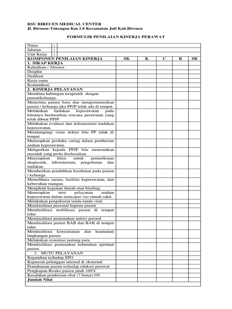 Contoh Format Penilaian Kinerja Perawat Pdf - Format Penilaian Kinerja Perawat Di Rumah Sakit Info Terkait Rumah / Pada perusahaan kegiatan penilaian kinerja karyawan sulit dilaksakan karena frekuensi tatap muka antara pihak manager dan karyawan sangat minim.. Format penilaian kinerja perawat rumah sakit islam purwokerto. Format surat pernyataan tanggung jawab mutlak ijazah sttb.docx file preview: Tidak hanya sekedar untuk mengetahui kualitas kinerja dari karyawan, dibuatnya surat evaluasi kinerja karyawan (performance review) juga mempunyai beberapa fungsi lain seperti di bawah ini Penilaian kinerja perawat7 02 2010salah satu upaya penjagaan komitmen perawat terhadap kinerja adalah melakukan evaluasidan penilaian terhadap kinerja contoh spk dan rkk serta rekomedasi. Jika masih ada yang kurang.