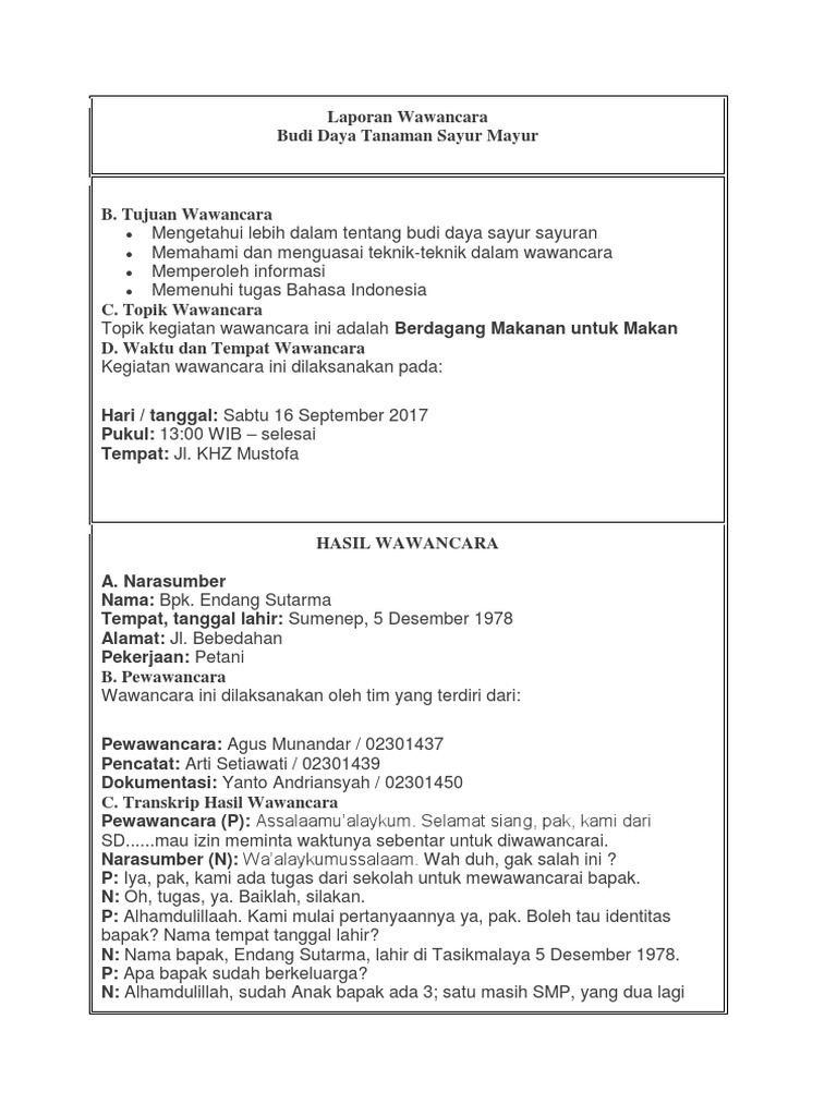 Nama Narasumber Pertanyaan Jawaban Netta from studyassistant-id.com Bulu di kepala dan badan tidak begitu lebat, tapi bulu di bagian ekor bisa sangat lebat dan panjang. Ibu sarmi tempat tanggal lahir grobogan 03 april 1963 agama. Menarik, detikers bisa belajar di sini. Nafisa tri septian (15330033) 2. Seperti laporan pasa umunya, yaitu bagian pendahuluan berisi tentang latar belakang, tujuan wawancara, topik, waktu dan tempat. Wawancara sendiri terbagi menjadi beberapa jenis. 4 contoh laporan hasil wawancara berbagai macam topik 04 oktober read more Seperti yang diketahui bahwa wawancara dapat dilakukan dengan pihak mana saja sesuai dengan ketentuan.