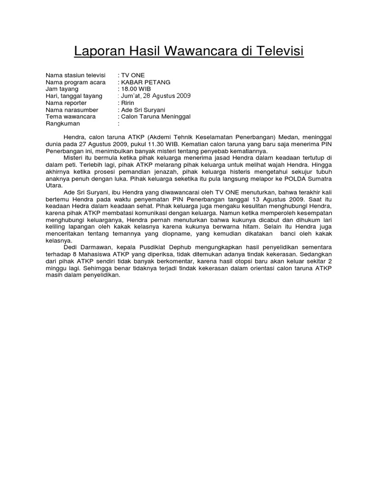 Seperti laporan pasa umunya, yaitu bagian pendahuluan berisi tentang latar belakang, tujuan wawancara, topik, waktu dan tempat. Sebelum membuat laporan hasil wawancara, anda sebaiknya memerhatikan beberapa hal dalam wawancara. Rizki dwi sulfani laporan hasil wawancara • latar belakang kegiatan wawancara ini, merupakan tugas di mata kuliah pengantar bisnis yang bertujuan untuk memperoleh informasi dari narasumber mengenai bagaimana cara mereka menjalankan bisnisnya. Kucing anggora adalah hewan yang unik. Laporan hasil wawancara tugas akhir mata kuliah perkembangan peserta didik program studi pendidikan fisika (3b) disusun oleh kelompok 4: